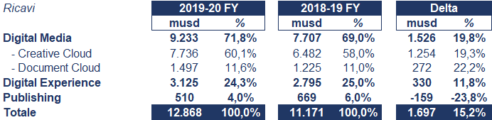 - Digital Media: fornisce soluzioni che consentono a individui e aziende di creare e pubblicare i propri contenuti digitali. In particolare il servizio in abbonamento Creative Cloud, consente di scaricare e accedere alle ultime versioni di prodotti creativi. Questo segmento serve creatori di contenuti, sviluppatori di app, appassionati, studenti, utenti di social media, professionisti, dipartimenti e agenzie di marketing, aziende ed editori;