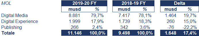 - Digital Experience: offre prodotti e servizi per la creazione, la gestione di processi che spaziano dall’analisi al commercio, per operatori di marketing, IT manager, responsabili di produzione, addetti alle vendite e analisti;