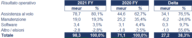 - Altri Servizi includono lo sviluppo commerciale e la fornitura di servizi al mercato non regolamentato, l’implementazione di un sistema globale di monitoraggio satellitare per il controllo del traffico aereo, lo sviluppo di servizi per la gestione del traffico di tutti i veicoli aerei, inclusi gli aeromobili a pilotaggio remoto.