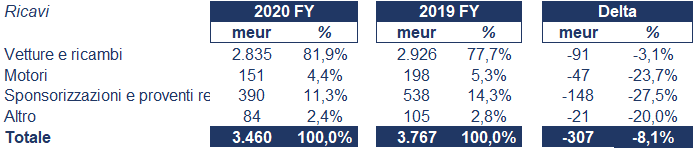 - Altro: si riferisce alle attività del Financial Services, di gestione dell’Autodromo del Mugello e di altre attività sportive.