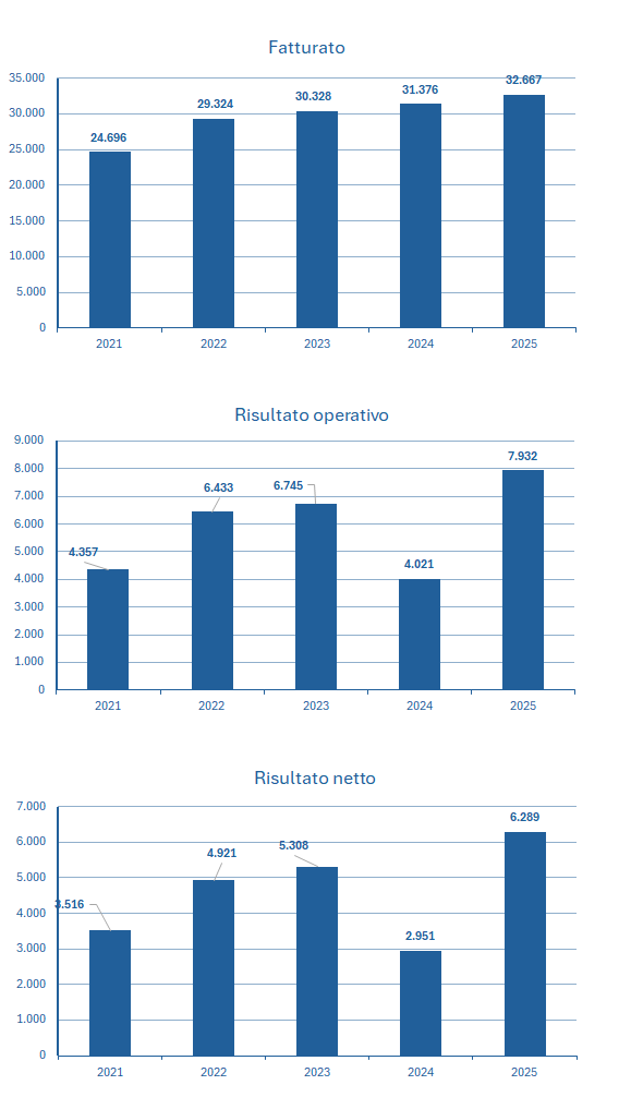 | Fatturato | 24.696 | 29.324 | 30.328 | 31.376 | 32.667 |