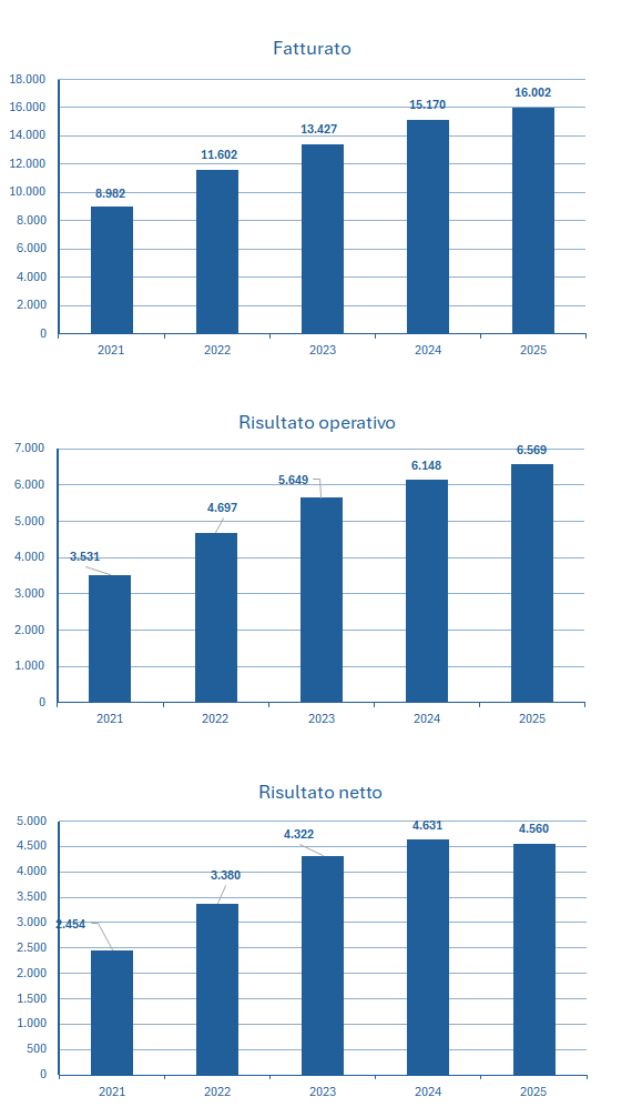 | Fatturato | 8.982 | 11.602 | 13.427 | 15.170 | 16.002 |