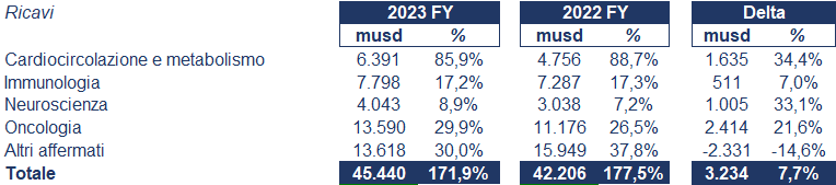 - Farmaci innovativi; offre medicinali soggetti a prescrizione nell’ambito dell’oftalmologia, neuroscienze, immunologia, epatologia, dermatologia, vie respiratorie, cardiocircolazione, renale e metabolismo;