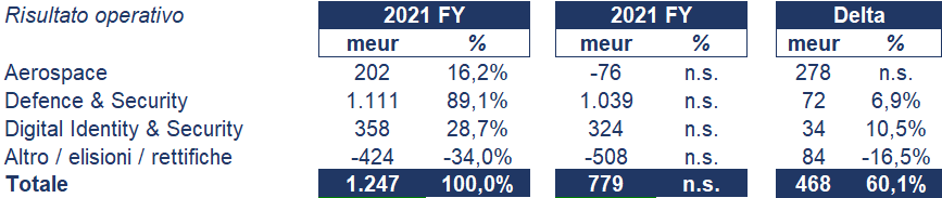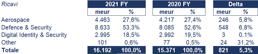 - Difesa e Sicurezza combina le attività “Comunicazioni sicure e sistemi informativi”, “Sistemi terrestri e aerei” e “Sistemi di missione di difesa” sviluppando attrezzature, sistemi e servizi per le forze armate e per la protezione di reti e infrastrutture, principalmente per una base di clienti istituzionale;