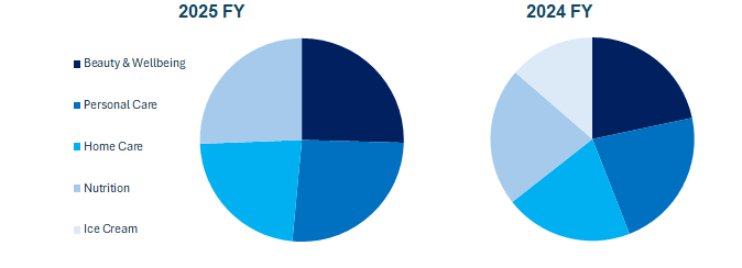 - Alimentare: comprende, tra i prodotti distribuiti in Italia, i cibi pronti Knorr. Nel 2025 è stata deconsolidata la divisione gelati che include Algida, Magnum e Carte d’Or.